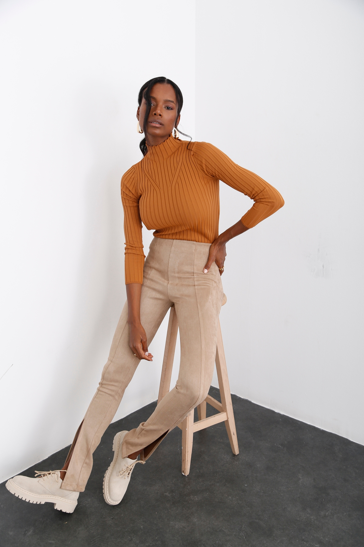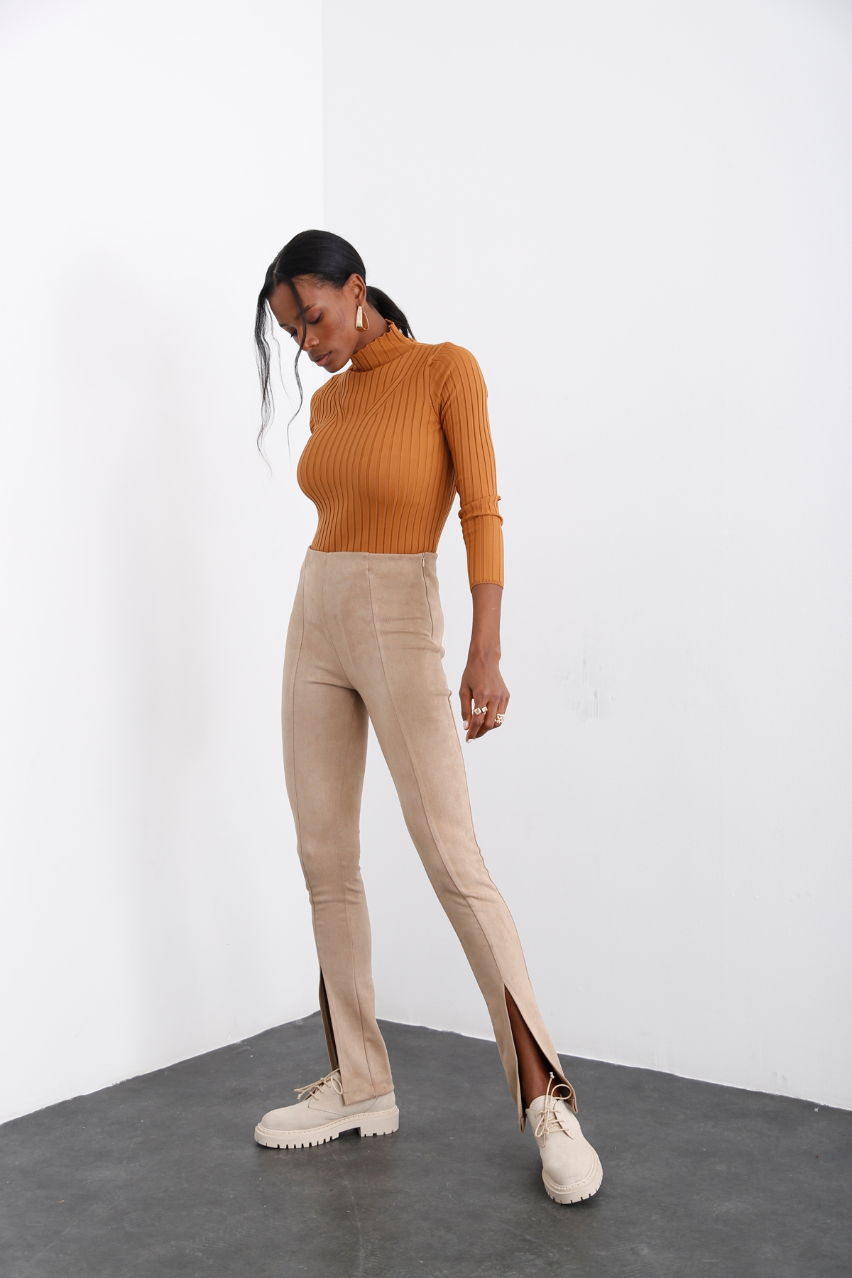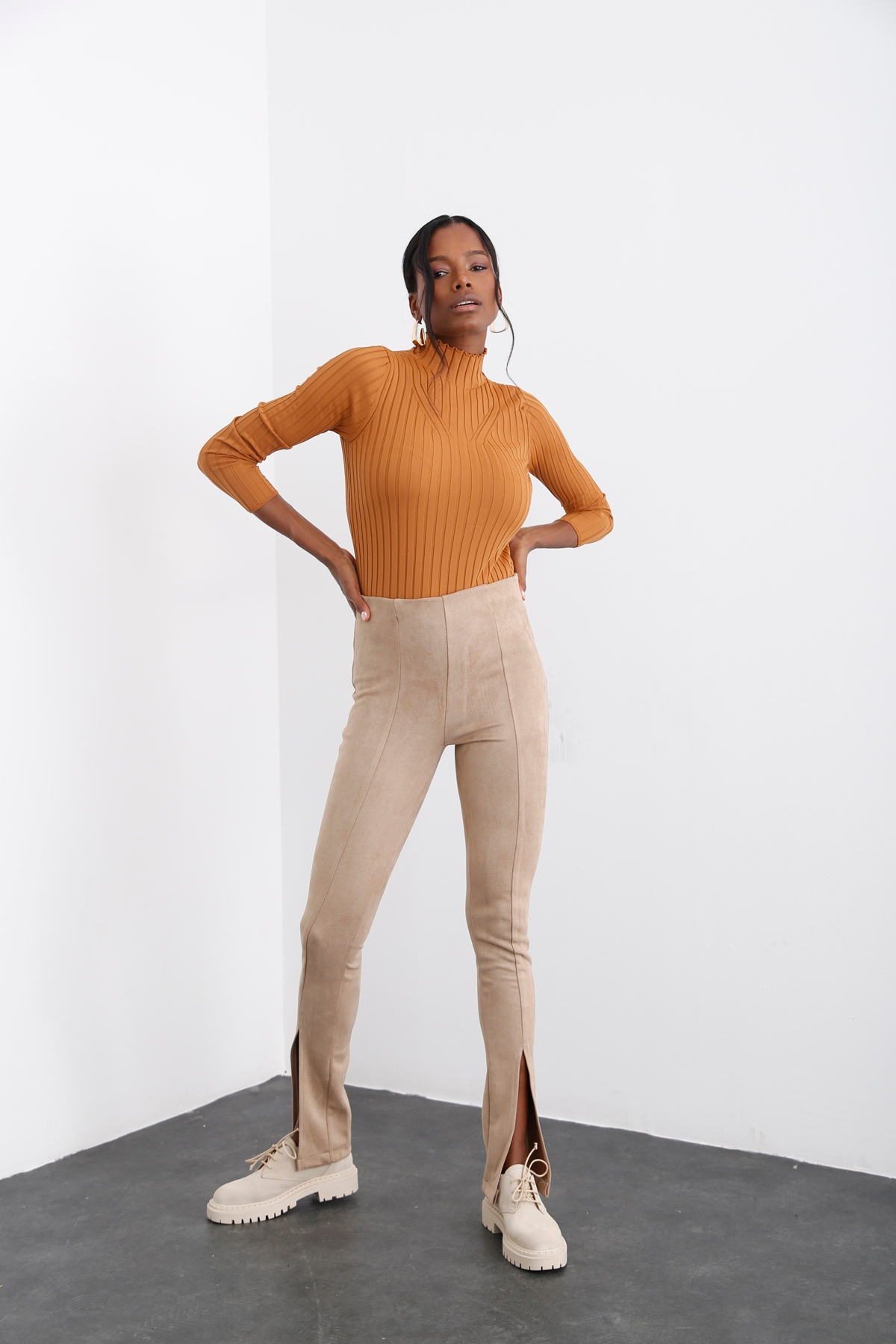 Bej Paçası Yırtmaçlı Süet Pantolon 70938