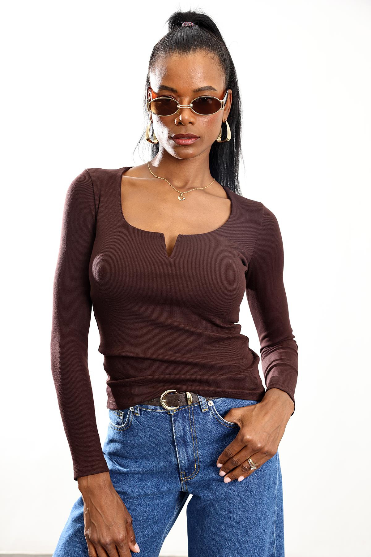 Kahverengi Yakası V Detaylı Uzun Kollu Tişört 2260