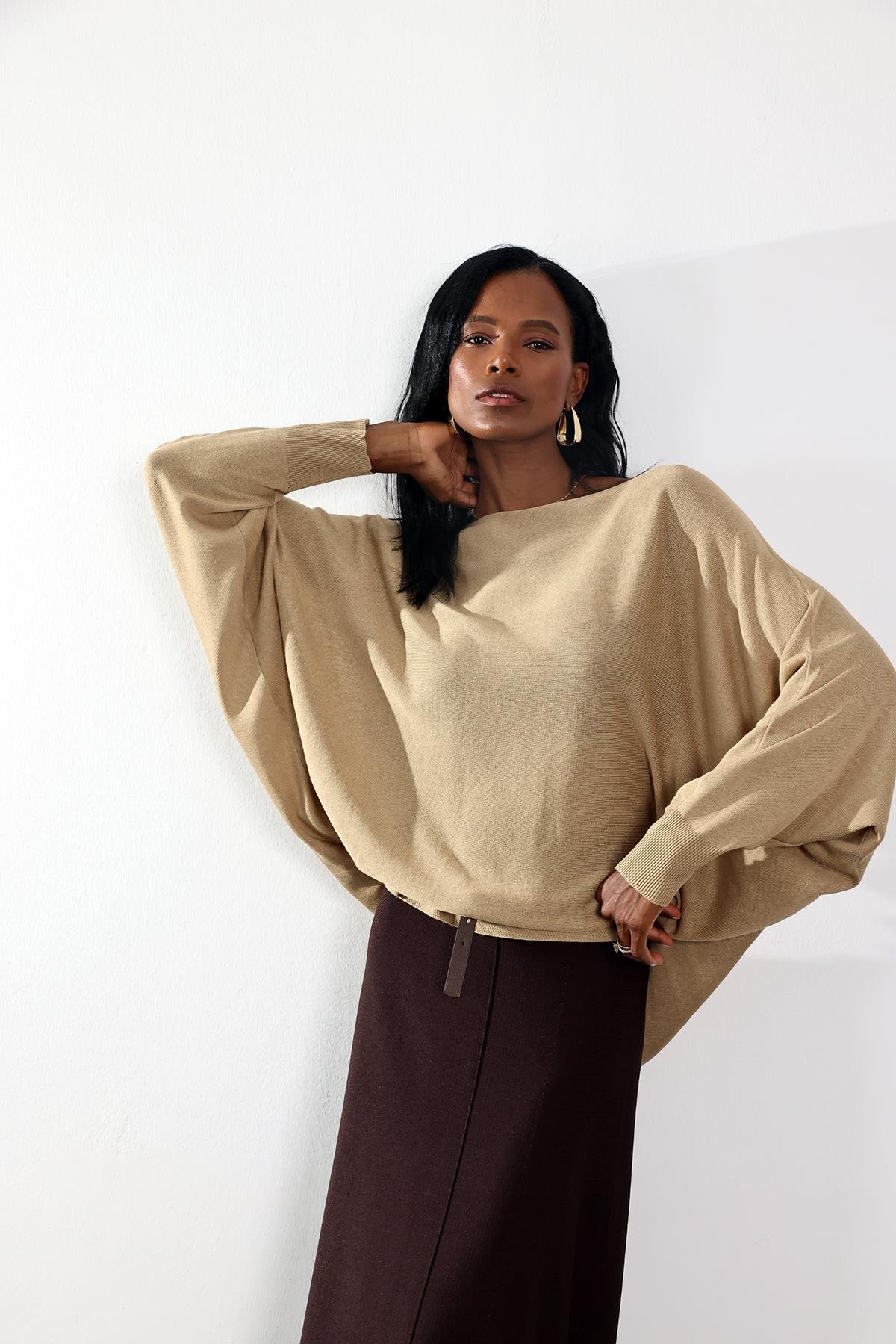 Kahverengi Yarasa Kol Triko Kum Beji Yarasa Kol Triko