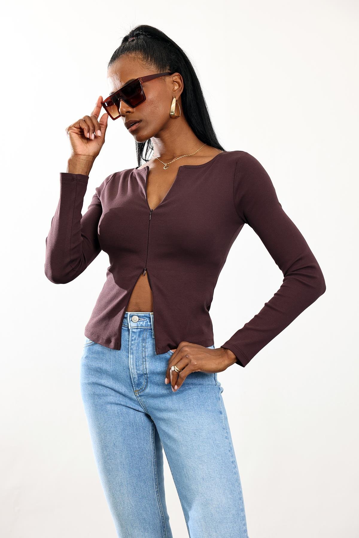 Mürdüm Çift Fermuarlı Uzun Kol Tişört 17141