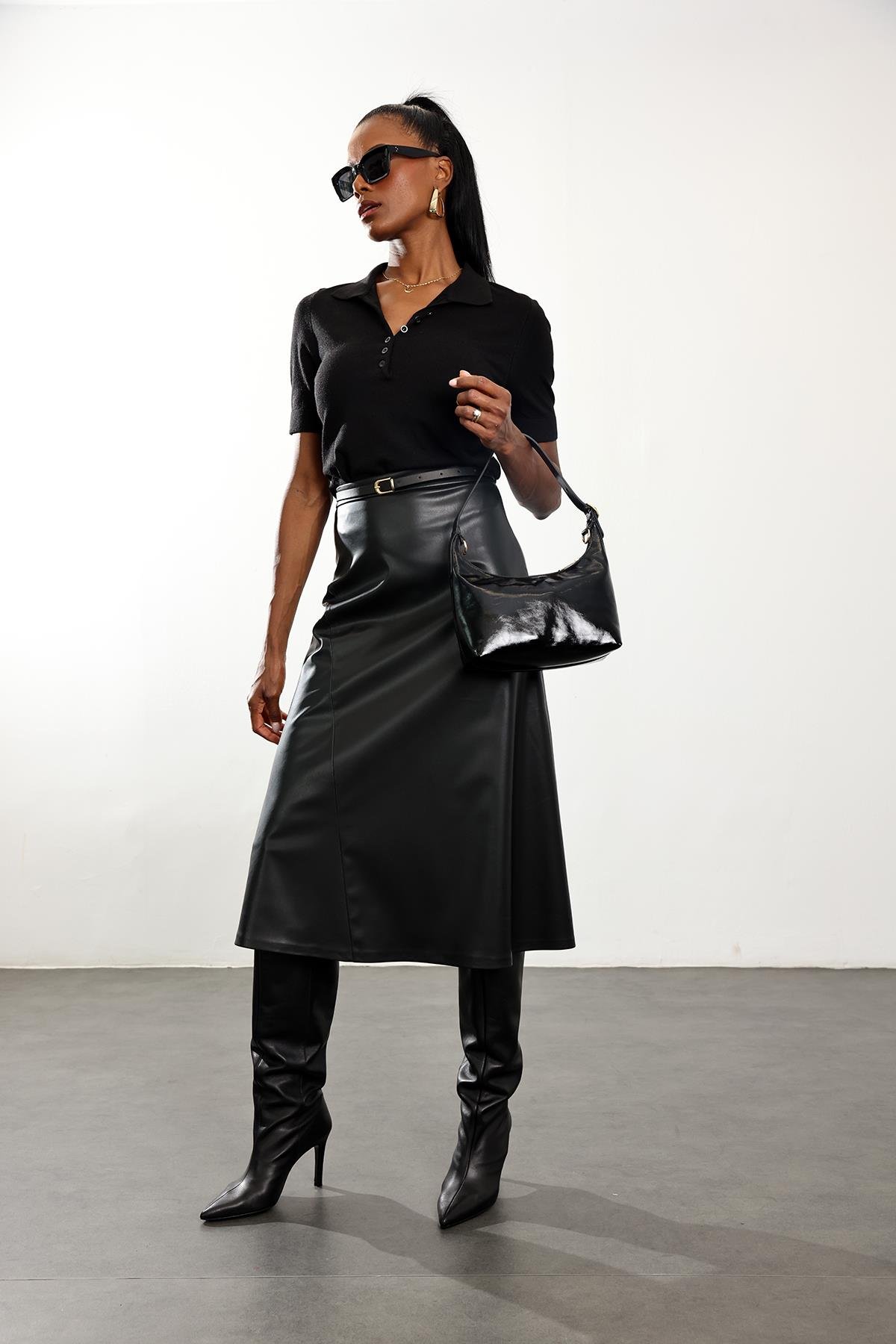 Siyah Kemerli Deri Midi Etek 221 (FW-ETK00725_Siyah)