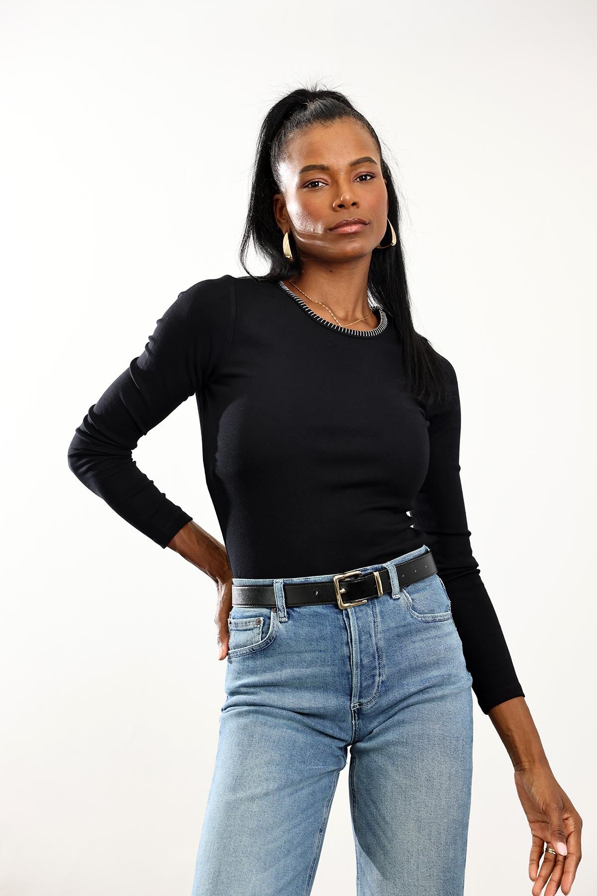 Siyah Yakası Biyeli Uzun Kol Tişört