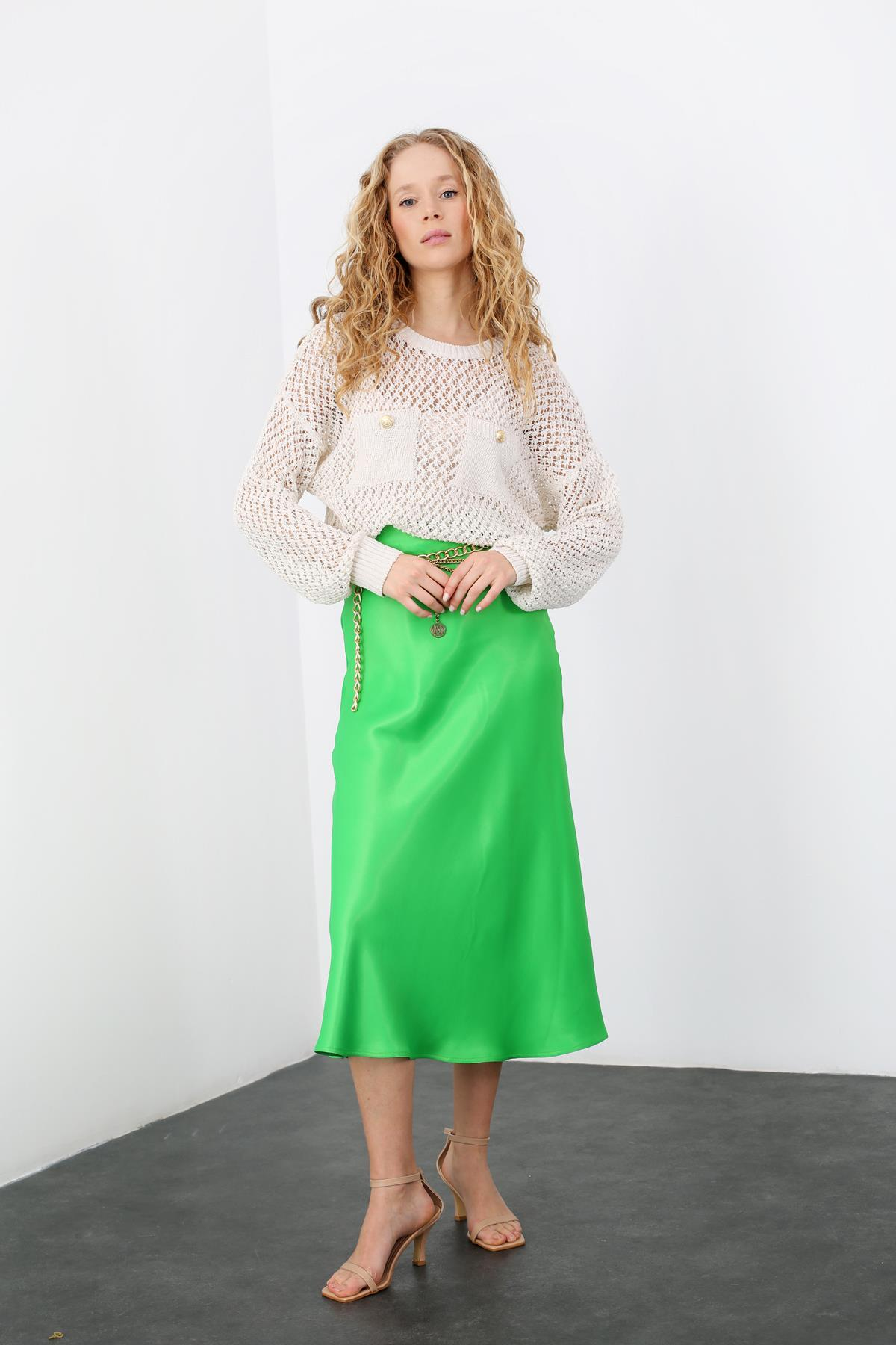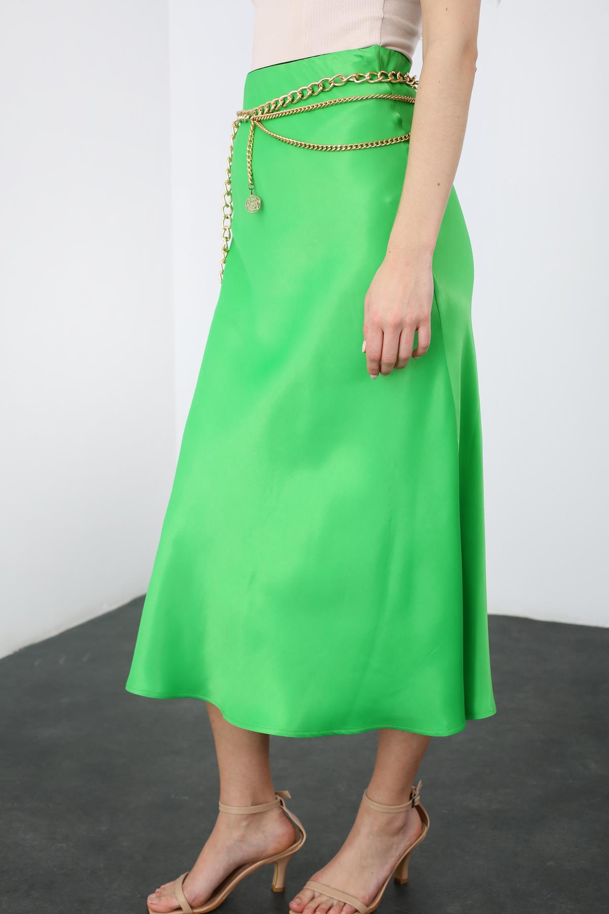 Yeşil Beli Lastikli Saten Verev Etek 14067