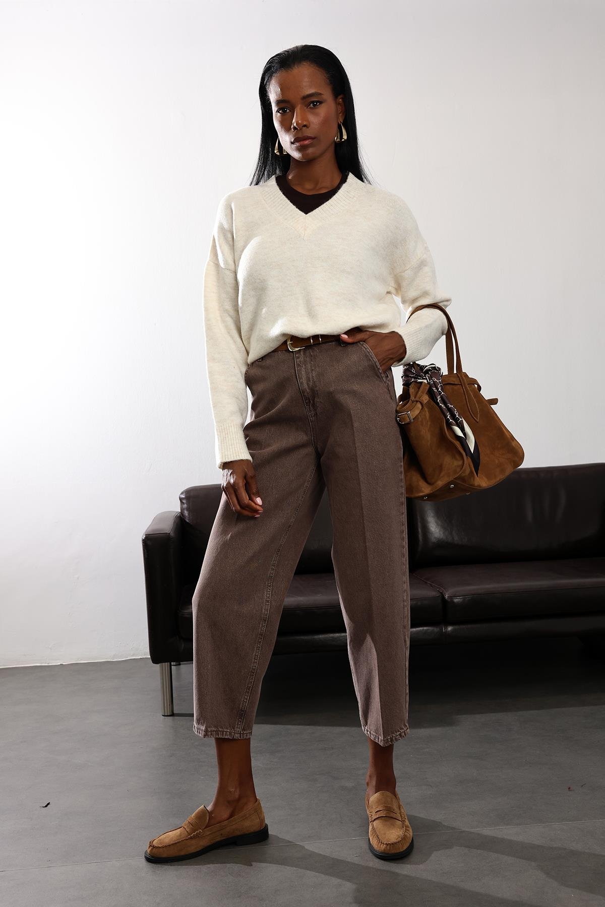 Yıkamalı Kahve Yüksek Bel Baggy Jean RM3004